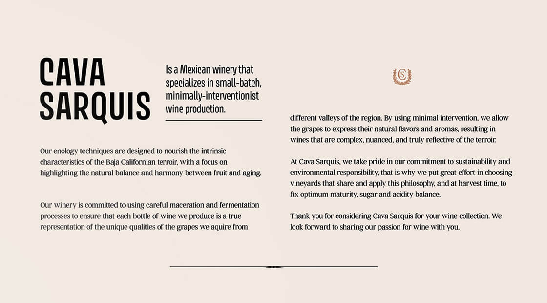 Al día de hoy nuestra prioridad y objetivo principal es presentar cada una de nuestras etiquetas en este proyecto, llamado Cava Sarquis, como propuestas con mucha personalidad, vinos carismáticos e interesantes, que cuenten historias de la tierra de donde provienen y de las manos que lo produjeron.